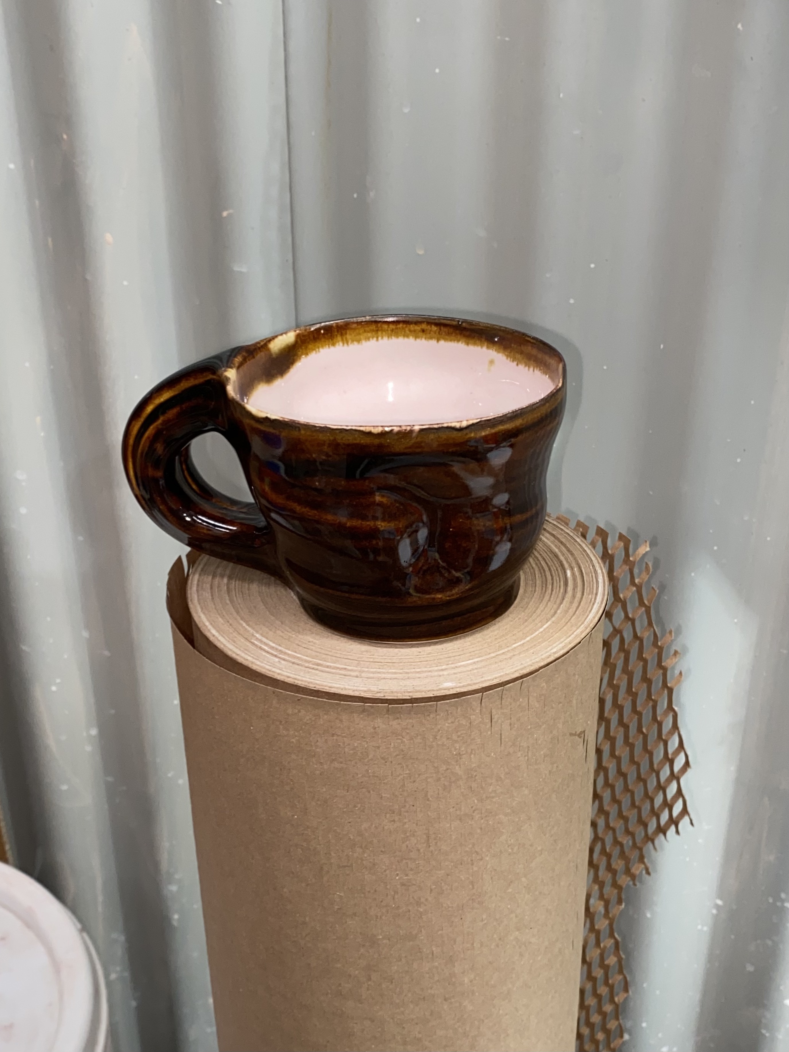 Wheel thrown and altered mug with thickly grooved handles. Smaller version of the Wobble Mug.